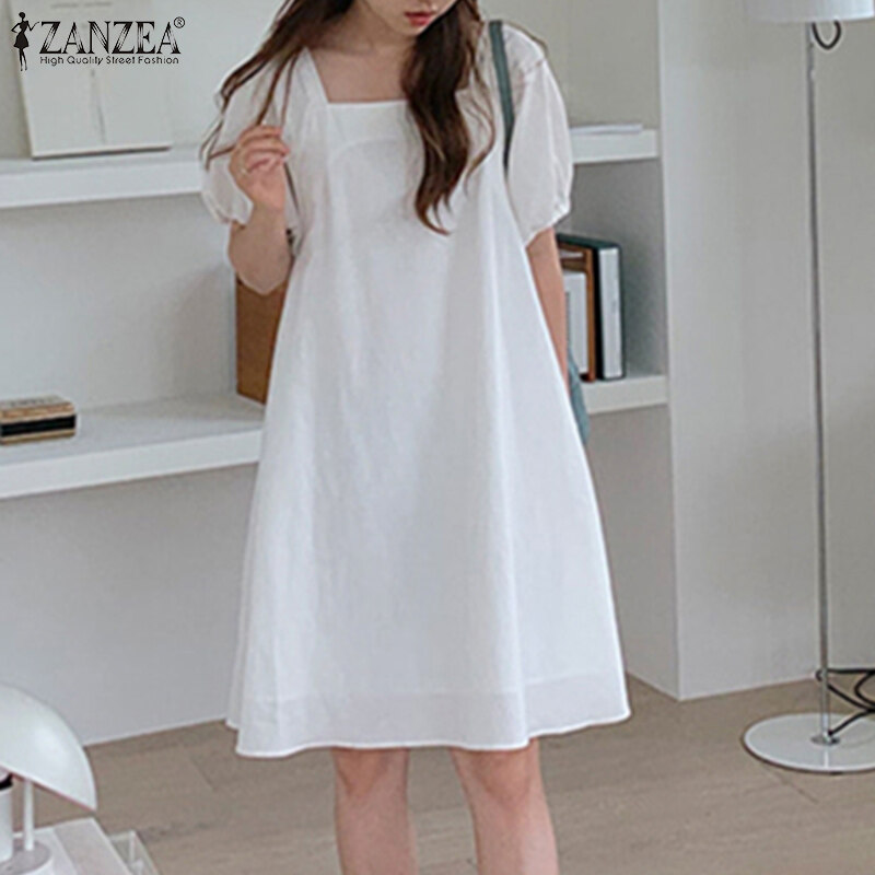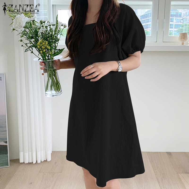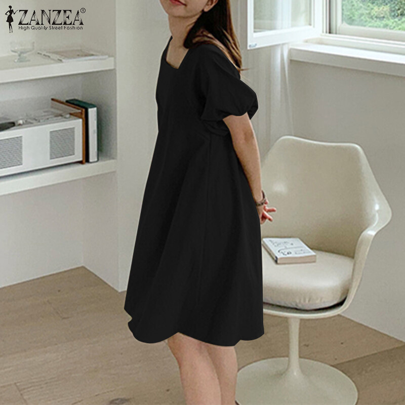 ZANZEA Korean Style Women Elastic Cuff Mini Dress Backless Tie Summer Solid Dress
