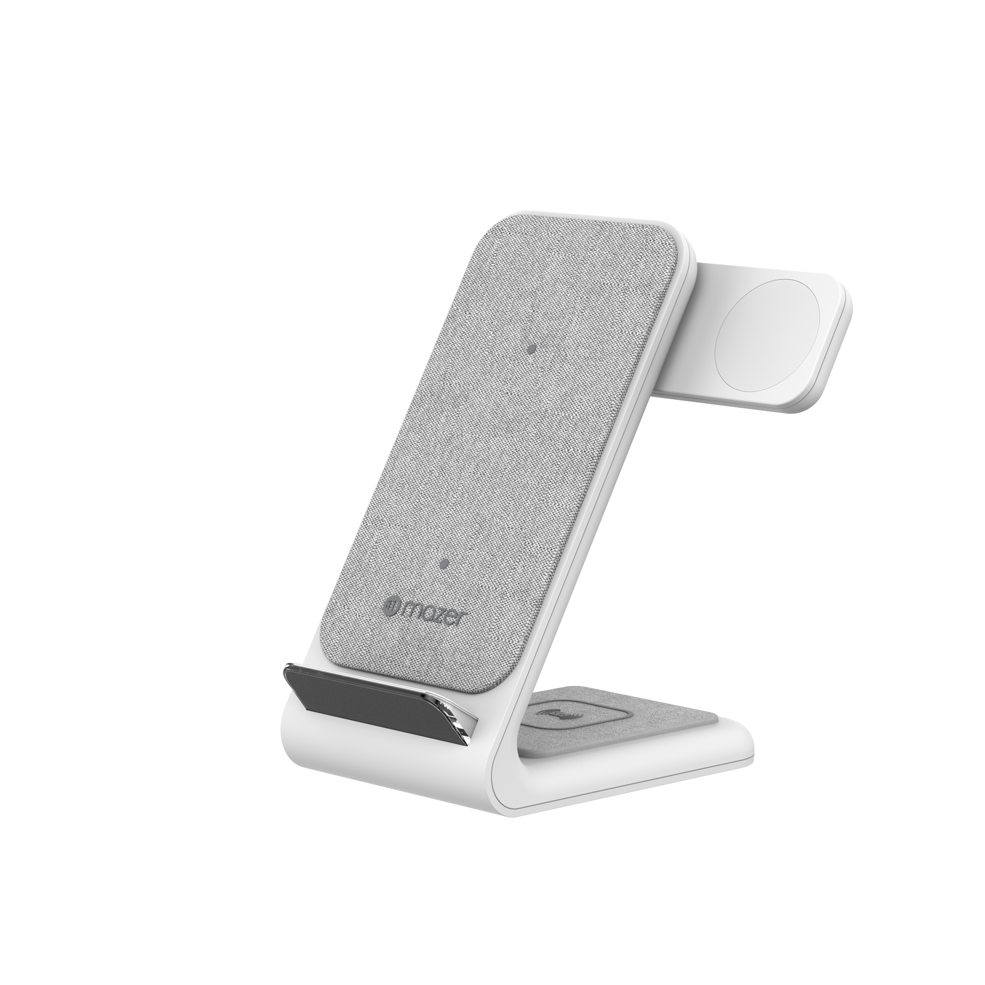 Mazer Wi.DESK SWING-V2 3-in-1 Wireless desktop charger with Special Design of Cooling System&Finished with Premium Fabric Design.Wireless charging stand that rejuvenates three devices at once. Slim and sleek, with a small footprint that takes up minimal space on a desk or nightstand.Save space and charge 3 devices wirelessly at the same time with the smarter wireless charging stand, Mazer Wi.DESK SWING-V2.Dedicated wireless charging stations for wireless phones, AirPods, and a swing-out charging arm for Apple Watch makes Wi.DESK SWING-V2 the perfect desk mate. And for even more convenience and easy use, three indicator lights illuminate to confirm charging, then turn off thirty seconds later.Wil.DESK SWING-V2 is the smarter way to wirelessly charge your favourite devices.Charges 3 devices at once: phone, AirPods/AirPods Pro and Apple Watch (all series) Qi certified to work with Qi enabled devicesPlugs into power with a USB-C to USB-C cable (1.5m cable included) Swing arm allows Apple Watch face to be visible in nightstand mode while charging Compatible with AirPods in wireless charging case Compatible with most phone cases (non-metal) up to 5mm thick