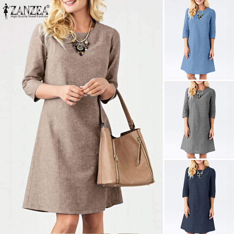 ZANZEA Women Vintage Simple 3/4 Sleeve Midi Dresses Loose Solid Round Neck Sundress #15